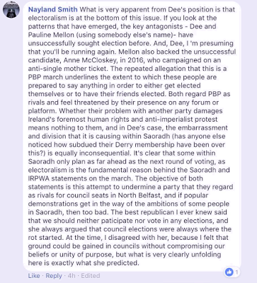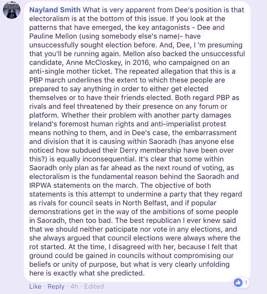 People raising concerns today are being accused of trying to take control of and destroy the march, people are abused for voicing an opinion, or in my case for not even commenting. Yet if people are attacked and accused of having agendas for questioning something how can it be the ‘people’s march' as it has often been referred to? As a note to the march organisers; the people are the march anything else is the mere submission of an 11/1 form to the PSNI/NI Parade’s Commission and the related responsibility. And a further note to the organisers; when three members of your 12-strong committee are being publicly singled out for questioning or criticism over a committee decision the very least you owe them is public support and if you can’t manage that then you may want to rethink the position you have been gifted. Despite my differences with some of those ‘organisers’ I think it is horrendous that they have been left to face the backlash as others sit on the sidelines.