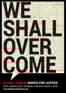 How can a poster cause controversy? Well the poster as you can see has the words ‘We Shall Over Come’ in large letters but the controversial element stems from the inclusion of a range of names and campaign issues the majority of which have no relevance to Bloody Sunday.
