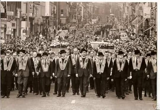It is in making mistakes about some basic and fundamental events in recent history in Northern Ireland that Edwards show a real careless streak. He drops a serious clanger when he states that the IRA bombing of the Four Step Inn took place in Sandy Row, whereas it is well known that the Four Step was on the Shankill Road. This cataclysmic event calcified rapidly hardening attitudes within the loyalist working class with many people calling for an intra-communal reaction. Immediately afterwards the DUP was formed, with Paisley using the immediate shock among people on the Shankill to announce his latest political project. In the background the UDA was formed. Most of the Shankill men I spoke to in my own research talked eidetically about rushing to the scene – many of them arriving onto the road having been at Windsor Park to watch a European Cup fixture involving Linfield and Belgian side Standard Liege. They described the carnage they witnessed on the night, and shortly thereafter the funerals of the two men killed. The funeral of Ernie Bates (uncle of Basher) and Alexander Andrews was the largest in the city since that of Edward Carson. To make such a fundamental factual error relating to a hugely important turn in the road toward loyalist paramilitarism for many young men is unforgivable. The funeral procession of Andrews and Bates makes it way down the Shankill