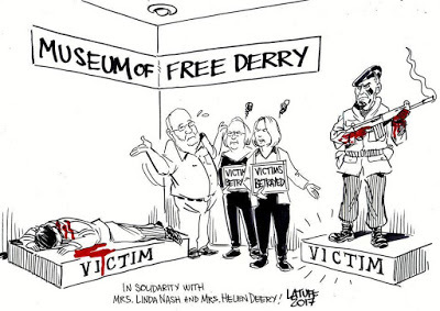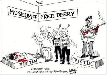 Carlos Latuff, a Brazilian political cartoonist, with a powerful and evocative depiction, thrusts his sharpened pen into the heart of policy and management at the Museum of Free Derry / Bloody Sunday Trust.