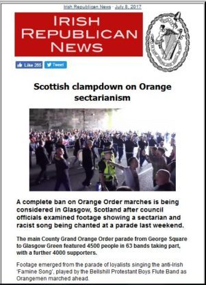 Tony: Well there’s certainly legislation in Scotland banning certain songs. In some cases Celtic fans that have been pulled from the stadium and brought up before the courts have successfully argued that the songs that they were singing were not sectarians but were you know ballads, Irish ballads, and, in fact, there’s very, very few cases where Celtic fans, even though they’ve been brought up before the courts, have been found guilty. You know, you have these parades in Doire and in Newry – places where there seventy-five percent of the population is Nationalist/Republican and you usually have about six or eight major marches to what they call ‘the field‘, where you know the bands and the onlookers gather, for an alcohol-induced, frenzied, you know debauched – and don’t forget – these are ‘Church parades’ – that’s the – the emphasis must be made that this is a religious outing – they market this as a celebration of their religion. Yet there’s nothing religious of any note that takes place at these so-called fields that they gather in afterwords.