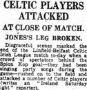 The Linfield fans rioted – attacked the Celtic players on the field, broke one of the legs of one of the Celtic players – which resulted in Belfast Celtic withdrawing from the Irish League at the time and Belfast Celtic was subsequently wound up the following year. So they killed off Belfast Celtic but they ain’t gonna do it to Glasgow Celtic ’cause they’re in for a beatin’ when we meet them.