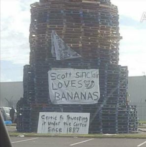 11 July 2017 Update: Bonfire that targets Celtic Football Club player, Scott Sinclair, a black man.
