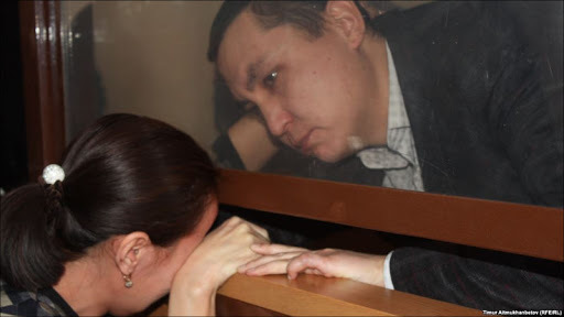 Nurbek Kushakbayev, in the cage for defendants, and his wife, after the verdict. Photo by Radio Azattyk.