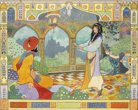 Sumber: http://oldchildrensbooks.tumblr.com/p...Kisahnya diawali oleh Scheherazade, Putri perdana menteri Persia yang dipersunting oleh Raja Shahryar. Sialnya bukannya menemukan kebahagiaan, keselamatan terancam karena sang raja punya tabiat mematikan, menghukum mati istrinya setelah malam pertama pernikahan sebagai balas dendam karena pernah dikhianati oleh istri pertamanya. Sudah puluhan wanita yang menjadi korban kebiadaban sang raja. Untunglah Scheherazade bukan hanya cantik, tetapi juga cerdas. Untuk mengulur waktu agar sang raja tak membunuhnya, perempuan cerdik ini selalu mengisahkan kisah menarik setiap malam. Kisahnya selalu bersambung setiap malam hingga 3 tahun atau 1001 malam. Sang raja akhirnya begitu tertarik dengan ceritanya hingga mengurungkan niatnya untuk membunuhnya. Kumpulan cerita Scheherazade inilah yang kelak dikenal sebagai Kisah 1001 Malam.Menilik nama tokohnya, mungkin dongeng ini berasal dari Persia atau India. Asal muasal ceritanya sendiri dapat ditelusuri kembali dari Arab, Persia, Mesopotamia, Mediterania, Mesir hingga India. Beberapa cerita binatang dalam 1001 malam dipengaruhi oleh Kisah Pancatantra dan Jataka dari India. Cerita-cerita dalam dongeng ini bertema cinta, puisi, kisah berlatar belakang sejarah, fantasi dan sihir. Ironisnya di Timur Tengah, dongeng itu masih kalah tenar dibandingkan puisi. Kalau saja tak ada yang memperkenalkannya ke dunia luar, mungkin dongeng-dongeng itu tetap tinggal sebagai dongeng para saudagar dan pengelana padang pasir.