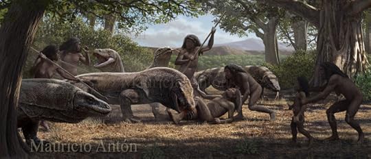 Perburuan gajah kerdil flores. Sumber: Mauricio Anton.Dalam The Hobbit, Tolkien menceritakan Smaug, naga raksasa terbang penjaga harta karun yang setiap saat mengancam desa-desa di sekitar istananya dengan semburan apinya. Di Flores, para manusia kerdil juga harus selalu hati-hati kalau tidak mau jadi mangsa naga. Ya memang ada naga yang tidak kalah hebatnya dengan Smaug. Naga yang mereka hadapi adalah naga komodo! Bagi para manusia kerdil, komodo sepanjang 2 meter pastilah sangat besar dan menyeramkan.