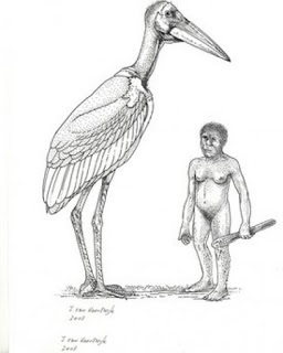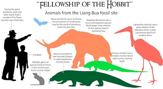 Komodo dan Homo floerensis. Sumber: Mauricio Anton.Tolkien menceritakan bagaimana penyihir Gandalf bersahabat dengan para elang raksasa. Di Flores, burung raksasa juga pernah hidup. Memang bukan elang, tapi bangau tontong raksasa. Para bangau pemakan bangkai itu bersaing dengan Homo floresiensis yang sama-sama juga mengincar bangkai binatang yang ditinggalkan predator. Menurut Thomas Sutikna dari Pusat Penelitian Arkeologi Nasional yang merupakan anggota tim penemu Homo floresiensis , bangau itu tingginya 170-180 sentimeter dengan bobot 16 kilogram.