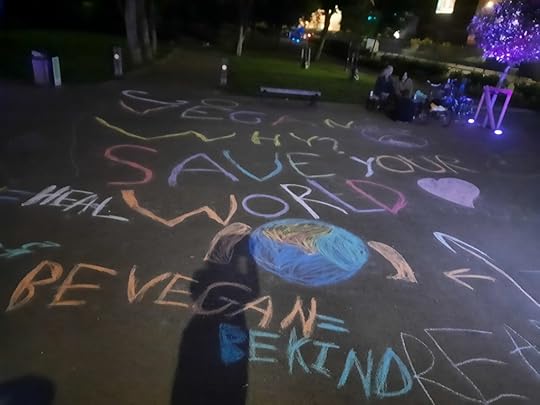 Vegan Chalking by Shaurya Dutta, 9 years, Essex, UK5. Draw your own creative posters, or print information out and hold an impromptu exhibition on your high streets or local park with several of them. Keep stones on their corners to prevent them from flying in the wind. You may also bring leaflets or show appropriate footage of animal exploitation industry on device screens if necessary for educational purposes. Parents may supervise children suitably if they are objecting to footage so there is no need to feel shy about showing footage or posters as evidence of a legal reality of a well known industry.