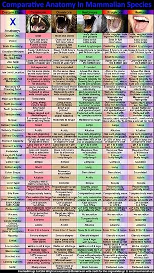 1. Teeth: We know that lions, tigers and leopards are Carnivores and have the apparatus to cruelly tear flesh and fatally injure victims with their teeth. Wolves, bears and hyenas are Omnivore and also have some very long teeth and can kill prey. Humans, however have smaller incisors to bite fruit with, instead of the mythical ‘canine’ teeth. Most of our teeth seem flat enough to chew plant based food with. In short our teeth resemble other natural frugivores such as apes whom we evolved from. Our jawline bears no semblance to Omnivore or Carnivore animals. We lack fangs.