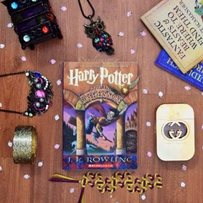 This months challenge will be the color challenge! Post a picture of a book using items or surroundings to show all the colors on your Harry Potter book cover! (Yes, it has to be the cover of the first book but it can be any edition).