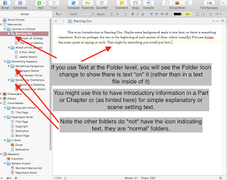 Setting up the binder for Word is not much different from the setup when you want to Print to Revise. The only real concern I have is to make sure that the text files are in the levels appropriate for inclusion in the Contents Option pane for compiling later. I recommend at least using folders for Chapters, with scenes in text files underneath those. If you use Parts, each of these should be in their own folder, with Chapters inside the Part folder and text files inside Chapter folders. If you choose to have introductory text for each Chapter or Part, as shown in the this image, you will need to make an adjustment to the Formatting Options pane when compiling (this would also be true in any compiling, not just for Word).