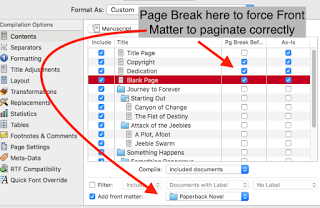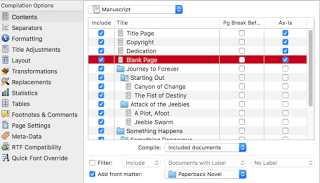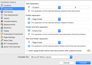 Just wanted to give you a head's up about my upcoming Cogitations. First, I'm doing a few scenario-based Scrivener compiles:  a fiction novel-length book for revising (print), then submission (Word), then compiled for Kindle Direct Publishing and epub for Smashwords. To keep the length on each one down, I'll probably do it in three posts (one for print, one for Word, and one for the e-book formats). The first one will be up later tonight or tomorrow morning.