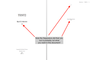This is what the document looks like in Word 2016 if you rely only on the Separators option pane to handle front matter and documents, with the scene separator appearing where there should probably be page breaks.