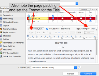 Fortunately, Scrivener handles this explicitly with the proper Compile options set.On the Separators pane, set “Text separator” to the “#” symbol, “Folder separator” to Page Break, “Folder and text separator” to "Empty line", and “Text and folder separator” to “Page break.” These will be the same as the settings above. With the Formatting pane, make sure to set up the checkboxes to reflect what’s in the various sections. As shown here, if you have any folders with text associated “on” them (like the intro text discussed earlier), make sure to check the “Text” box and format the text as well as the title. Check the Page padding number, and set it to appear as appropriate. The default for Scrivener for folders and text documents (those that are not, themselves, containers) is to insert 14 lines of padding, which should fit the criteria of Chapter titles above, but may not work for your scenes. Make sure to examine your output afterward, and make adjustments here as needed.