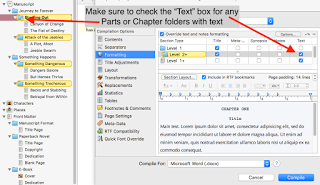 With the Formatting pane, when printing to revise you might consider the titles being pretty plain, really just enough for you or your editor(s) to be able to distinguish the transitions. Since I have Parts and Chapters, the folder levels should have their own settings (as they do here). Since neither of these two folder types has any text, I uncheck that checkbox. If yours do, say because you use introductions for each chapter or part, make sure the “Text” checkbox is checked, and format the text appropriately.