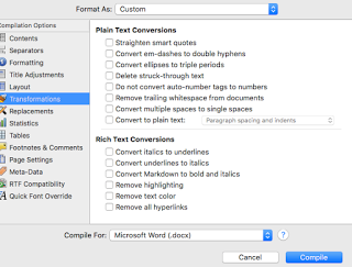 Transformations pane settings allow you to fix certain kinds of output issues; I recommend first compiling with all of these options disabled and see what the output looks like. My experience with recent versions of Word and Scrivener shows that smart quotes, ellipses, italics, em-dashes, and so forth all come through just fine, so I usually leave these all unchecked. Run it, and see if you like the output. If not, try enabling only exactly the Transformation you have issues with, and re-compile.Replacements will expand any text tokens you might use to substitute for long phrases in your document. If you use any such tokens, make sure the Replacements pane has the expanded version!