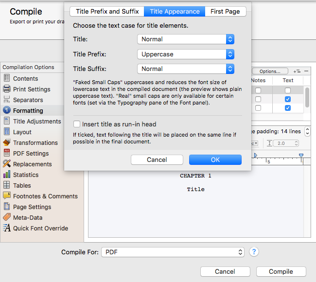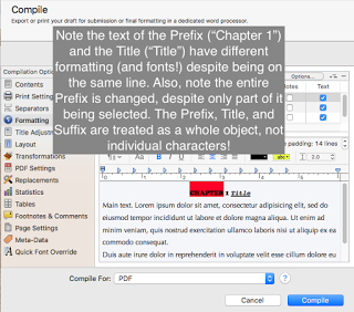 As I noted, there are quite a few settings available here, and they can be highly tuned for exactly the kind of formatting you need on your output document. With that in mind, it is also really easy to get lost in the woods and over-think everything. A couple of tips might help you manage these settings without having to go nuts. First, consider your document structure. If you name your Chapters, and the only sub-level beneath your Chapter folders is text document scenes without titles, you can format the Level 1 folders to have "Title" checked, remove the text from the Prefix and un-check "Text", then un-check "Title" from the Level 2+ text documents (make sure the right items are highlighted in the binder!), and format the Text there. I know a lot of writers who write with a different font and size than they want to be in the finished product, and often have different line spacing than the output needs as well. Take advantage of this to have your editing text settings set up to make your life easier when you write—say, by using a 14, or 16 point font with 1.2 or 1.5 line spacing you find easy to read on your screen—and then use the Formatting available here in this Options pane to switch how those text document will appear in the "Compile For:" output, such as 12-point Times New Roman, left-justified with an initial .5 inch paragraph indent and 2.0 line spacing.