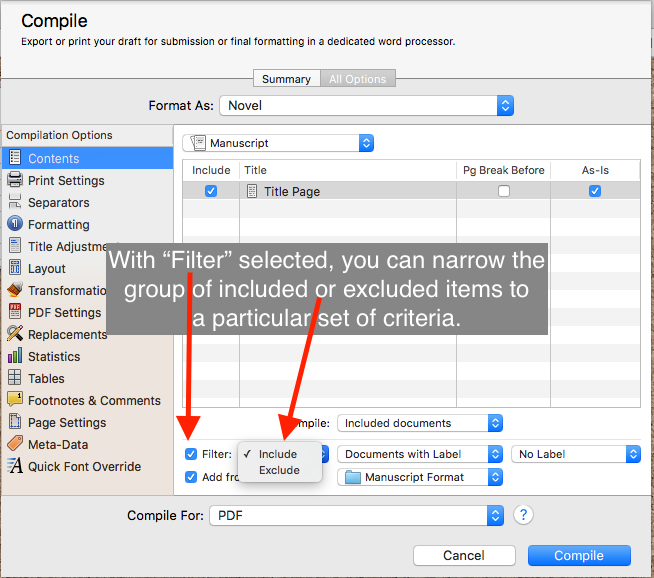 Let’s get right to it! The Contents option pane permits you to select what parts of your manuscript—or any sub-part of the project, in or out of the manuscript itself—you wish to “Compile For:” the current output type. By default, the entire manuscript is selected until you either save or compile. You can save the current settings as the “default” for this project by holding the OPTION key on a Mac and clicking the “Compile” button (which changes to read “Save” when the Option key is held down). On Windows, there is a “Save…” button in the interface, which will save the current settings as the new “default” for this project.