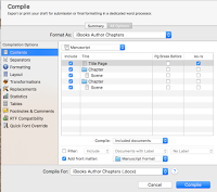 With the “All Options” tab selected, the top and bottom menus remain the same as they were on the Summary tab. The center area, however, changes to reveal all the options, and their settings. In the left pane is the list of the currently applicable options. The list of settings that apply will depend on the output format, which is set under the “Compile For:” menu at the bottom. The “Format As:” option at the top contains a list of possible Presets, which have default settings for the Options as well as a preferred “Compile For:” setting. You can change these within a project, and when you click the “Compile” button any changes you have made will stick to that project. You can also create new presets, and I will cover that in a separate blog entry. The key thing to remember about the Compile sheet: Compile is all about the “Compile For:” menu. The list of Options on the left pane and their actual settings in the right pane tell the Compiler how to send your project to the “Compile For:” menu’s selection. The Presets at the top simply change the settings of those options based on either the default Scrivener-created settings or with the settings you have changed—either in the project with which you’re working or by saving a custom preset. Now, let’s take a look at the "Compile For" selections.