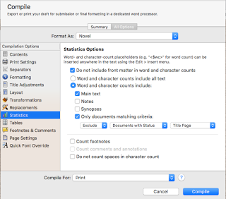 Finally, that brings us to the Statistics Option pane. This pane, simply explained, allows you to configure how certain of the placeholders work if you use them in your project. By default, the Title Page of many projects uses the $wc100 placeholder in the upper-right of the Title page, a placeholder that will be replaced with the current document’s word count to the nearest 100 words. On the Statistics pane, you can tell the compiler to only count words or characters in certain places, to include even footnotes, to or not to include spaces with character counts, and others.And, with that, we’ve knocked out the final four of the five “always-on” Options panes in the Compile sheet. Yay, us! Coming up in the next few blogs I will cover some of the other panes that occur often, but not always, starting with the Separators, Layout, and Tables Options panes. As always, if you have questions or comments about compiling in Scrivener: other common options, just leave them below!