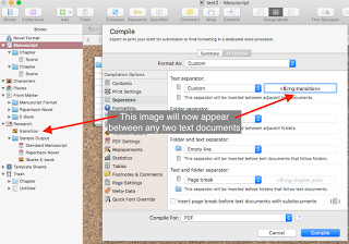 break, or a custom separator you type in the space next to the selection. You can get creative here if you want to since the “custom” type permits a line of text to be included. This includes the Image Placeholder tags. The image placeholder tag is <$img:>, with a required element after the colon that identifies the image to use. If you have already imported the image into the binder (which I recommend, just for simplicity’s sake), you can simply use the name that shows up in the binder. As an example, let’s say you have an image file called “transition”, which you have placed in your binder. To use that file in your “custom” file->file Separator type, select “Custom” for the Text separator and type <$img:transition> into the text field next to the popup menu. This image will now appear with a blank line above and another below