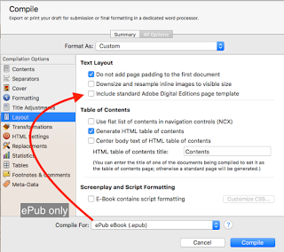Finally, if you select .epub or .mobi output types, there are several additional options that appear to help control the layout and appearance of these documents. Selecting “Downsize and resize inline images to visible size” will change the sizing on any inline images for your document to the actual visible size of the image in the document, for the compile output only, in order to reduce the size of the compiled file. For ePub, “Include standard Adobe Digital Editions page template” will generate an ADE file which may be required for certain devices to properly display the document. If your output is aimed at these documents (the Kobo, Sony reader, Nook, and others), select this option to make sure the ADE file is created. In the .mobi output type, this option changes to “Book begins after front matter” instead; selecting it with Front Matter enabled on the Contents Option pane will mark the first page of the actual manuscript as the start of the book, bypassing the any of the front matter when the reader opens the file initially.