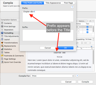 Whatever level you have selected, you can make changes to how the Title Prefix & Suffix, Title Appearance, and First Page display for that level by clicking on the Section Layout button. With the Prefix and Suffix, you can control the display of the items before and after the selected level's title as shown here. Since the "Title" checkbox is checked, the name of the folder or file is displayed (here, just as "Title" which is a placeholder name). As you can see, an entry in the "Prefix" shows up before the Title. In this case, the word "Chapter" and the special character $t enclosed in less than/greater than symbols (<, >), as well as a paragraph character (the blue ¶ symbol). What that will do is put the text "Chapter " and insert the appropriate text for the chapter number: "One," "Two," etc., counting from the beginning of the current Contents—that is, whatever you have selected in the Contents pane. You can force renumbering to start somewhere else, using certain placeholder tags, but I'm going to cover most of those in a different blog post.