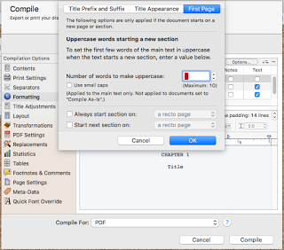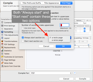 The First Page tab is where you can change certain aspects of how the compiled document treats the first page of a new section (including the first page of the document, in most cases). In the first image, you can see the various settings options: "Uppercase words" (and "Use small caps"), and "always start"/"start next section on." Uppercase words allows you to tell the compiler how many words of a new section will be in uppercase (or, use small caps instead if that option is checked), and the always start/start next options allow you to specify if all new sections (or only the next) will be forced to start on a verso (left-side, basically) or recto (right-side) page.
