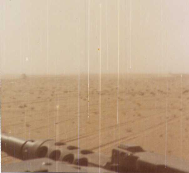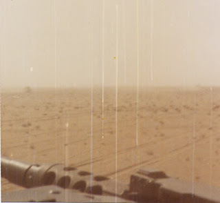 After several days of the "air war" (as I believe it was called by the news media), the Brave Rifles received a new mission, and new orders. We were to pack up, HET our vehicles westward up the Tapline road, and occupy a screen line to observe for any possible enemy attempts to penetrate the Saudi border from the west of the old neutral zone between Saudi Arabia and Iraq. Dutifully, we did so, and assumed positions along a line just a few kilometers south of the actual border. Scout platoons were dug into positions where they could overwatch a large valley, with the tank platoons in a more central, hide location with OPs just downslope of the ridgeline, occupied 24/7 in a rotation from tank to tank. Loaders and drivers were the primary occupiers of the OP, with the gunner of the tank currently on rotation stationed in the designated tank on the .50 cal MG. Any activity in the valley was immediately called up to the on-duty tank gunner over a field phone, who then clarified the information and if needed relayed the information with a standard report format up to the troop command net, who did the same up to Squadron. Not much happened, though; the desert out in that part of Saudi Arabia and Iraq is trackless, mostly featureless, and nearly impossible to navigate safely without advanced equipment (like, say, GPS). There were occasional sightings, mostly of Bedouin tribes shepherding their livestock (often goats) through the area, but rarely anything of military value.