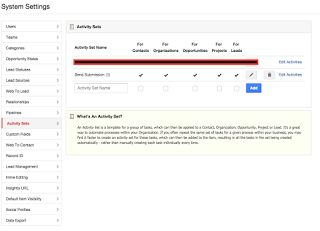 After setting up my custom fields, I create an Activity Set for submissions—make sure to check the checkboxes for all options—and then define the individual activities that make up the set.