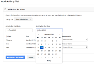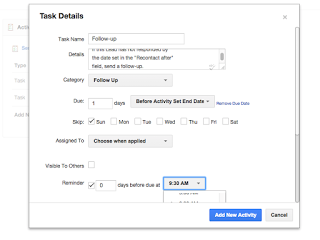 Second, I add an activity set to the Lead, which auto-adds the tasks I already created. I set the start date to the day before I want to send the query, and the end date to the date after their "Recontact by" date, and click "Add Activity Set to Lead." The tasks I earlier defined for the Activity Set are added automatically to the Lead, with reminders!