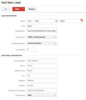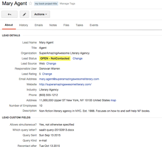 The way I look at submissions, they are essentially a Qualifying activity for selling my writing project. Agents, publishers, and/or whatever other organizations to whom I submit queries or proposals are, in essence, Leads for my Author brand. The process of sending the submission is the qualification process for those Leads. With that in mind, I need to keep track of a few pieces of information about Leads that I don't need for a Contact—which would be, say, a blog reader, or a subscriber to my mailing list—like the date the submission was sent, the kind of submission it was, and whether that Lead accepts simultaneous submissions.