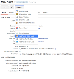Now, whenever I am ready to submit a query letter, book proposal, or what have you, I just create a Lead for the Agency or Publisher, attach the appropriate Tag, Add the Activity Set to the newly created Lead, and let my devices remind me when it is time to send. Easy-peasy! Okay, yes… there is a little bit of setup, and a little bit of preliminary work, but it's really no harder IMO than setting up a spreadsheet with the same information, and I have the advantage of automatic reminders for both the initial submission and later follow-up.