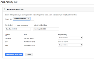 An activity set is a group of to-dos, events, emails, or other actions that I want to take for each step of the submission process, which I loosely define as: sending submission, marking Lead, follow-up.