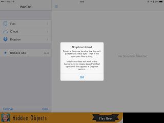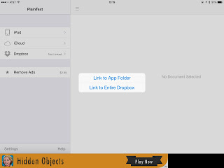 First, open Plain Text 2 and there will be an option along the left edge to link to Dropbox. Clicking on this will ask whether you want to link Plain Text 2 to the entire Dropbox hierarchy, or only to the App folder for Plain Text 2.