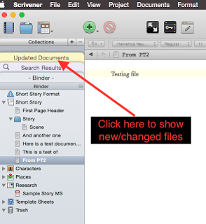 Any new or modified files will appear in the Binder in Scrivener, under the "Updated Documents" collection. To reveal the collections, if they are not already visible, click on the Collections button at the top left of the Scrivener toolbar