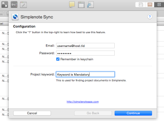 Please note that the Project keyword field is mandatory, as this is the method that Scrivener uses to sync with Simplenote.