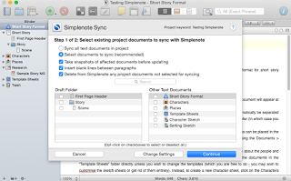 Next, you're greeted with a sheet to select which documents should sync between Scrivener and Simplenote for this project. By default, this is set to "Select documents to sync", which is the recommended setting. The rationale behind this setting is that you should sync only the documents you will work on remotely, saving space and bandwidth. For example, you might wish to work on text documents within the "Draft" folder (the generic name for the project's main content, whether a short story or a manuscript, etc.), as well as Characters, but not the Places or Setting items.The settings for "Take snapshots of affected documents before updating", "Insert blank lines between paragraphs", and "Delete from Simplenote any project documents not selected for syncing" are enabled by default. Deselecting "Take snapshots" will stop Scrivener from making snapshot backups of the selected files before uploading, and before syncing back, and is not recommended (that is, leave it selected, that way it will make snapshots of the local file before any changes are uploaded or synced). Inserting blank lines between paragraphs will insert a blank link after any paragraph in the Scrivener document. Delete from Simplenote will remove from the Simplenote service any documents which are present in Simplenote—and are part of the current project—but which are not selected to be synced. As an example, lets say you work on one chapter at a time. You create a new folder for the chapter, and sync that folder and all of its subfiles to Simplenote. Then, after several weeks of editing, etc., you regard the chapter as finished, and sync all your changes back into Scrivener. Next, you work on chapter 2, create the Chapter 2 folder and some subfiles, then mark them for sync to Simplenote. If you then un-check the Chapter 1 folder & files, and leave "Delete from Simplenote any project documents not selected for syncing", all of the Chapter 1 files & folder(s) will be deleted from Simplenote (though, since you've already synced up from before, you will not be losing information). This can be a handy way to stay focused only on the highest-priority items, by removing any files that have already been finished and leaving behind only the ones that are still being edited.