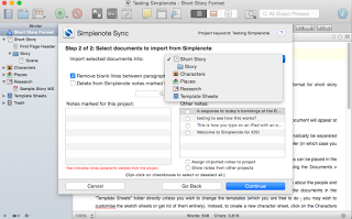 On the right, you can also see what the Simplenote interface looks like if you have the "notes" pane expanded (click the < at the top left of the screen). This allows you to pick and choose between seeing "All Notes" (that is, everything in your Simplenote account), or only notes with particular "Tags" (such as "Scrivener", which is automatically tagged to any Scrivener-synced document, or "Testing_Simplenote", which is the tag automatically created from the Project Keyword when it was created in the Scrivener project).When you have been out and about on your iPad (or iPhone), and you are back to your computer ready to re-sync the changes you've made on your project while working on the iPad, you basically do the same steps: Select "File->Sync->with Simplenote …", and make sure that any files from Scrivener you wish to keep synced with the Simplenote project are selected; then, click "Continue" to select any new files that you wish to sync, which you may have created in Simplenote but are not yet in the Scrivener project, and click "Continue" again. This will sync any changed documents (creating a snapshot, first, if that option is selected), then push any new Scrivener documents to Simplenote, pull any new Simplenote notes to Scrivener, and then show you the "Sync Completed" sheet.