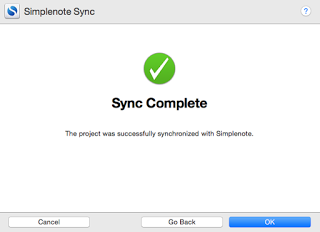 Once you've selected where to sync these files, and which ones to sync, click Continue and it will sync the files you've selected up to Simplenote, and any you've told it to bring down from Simplenote. It should then give you a "Sync Complete" message like the one on the right.