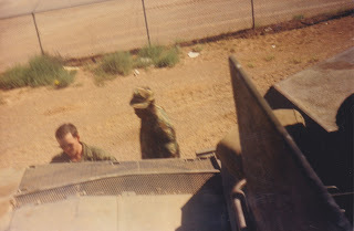 After several weeks of being in the deep desert, watching our screen line, we were temporarily relieved by another unit (whose identity escapes me). We withdrew back toward the Squadron combat trains and Tactical Operations Center (TOC), where we were rotated onto Deuce-and-a-half trucks and told to bring our personal hygiene kits and a change of uniform. We drove out into the desert a bit, and were delivered to a US Air Force air base of some kind or another, only a few kilometers south of our position, where they had a fully-functioning hot shower for thirty people set up. We took a glorious shower, under tents and with a seemingly unending supply of hot water, shaved, got all together tidied up in a way we hadn't been able to get in many weeks, then changed into clean duds (well, clean Combat Vehicle Crewman (CVC) suits, the fire-retardant Nomex suits worn by tankers in battle), and went back to the Squadron TOC for a hot meal as well. T-Rations were the order of the day for us on the screen line, and today's meal was still T-Rations, but this time we got to eat them sitting at an actual table and actually hot, not just still-warm from the mermites on the front deck of the tank. There was a Class VI supply truck there, and I was able to stock up on batteries, smokes (at the time, I was a smoker), and some pogey bait. We re-mounted the tanks, relieved the unit sent to relieve us, and resumed our screen mission.