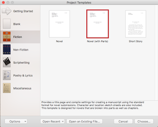 Now, the Scrivener project itself. First, I opted for a "Fiction->Novel (with Parts)" template. When I am writing a fiction piece, I usually choose this as the base because of how I organize—many of you won't do it this way, and that's okay, just know that my brain is weird and this is how I roll. This format makes it easy for me to organize initially.