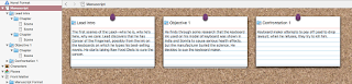 by James Scott Bell), and I put each of the major elements Lead, Objective (1), Confrontation (1), Obj(2), Confront(2) etc. in as a "Part" (a.k.a, Folder) at the main level underneath "Manuscript" on the corkboard. I then rename those folders to something more descriptive, and use the heck out of the corkboard's note feature to give a brief description of what should happen inside this folder. Inside them, I put "Chapters", which I also give descriptive names and notes (these example Chapters don't have descriptive names, this is just a sample image). From there I add scenes to get started, and write the scenes as I go. Sometimes, I find I need additional items—maybe there are multiple Confrontations—and I can just drop them right in, add chapters & scenes ad hoc, and keep on keeping on. As I go along, I modify the structure based on how the story develops, adding or deleting things as needed.