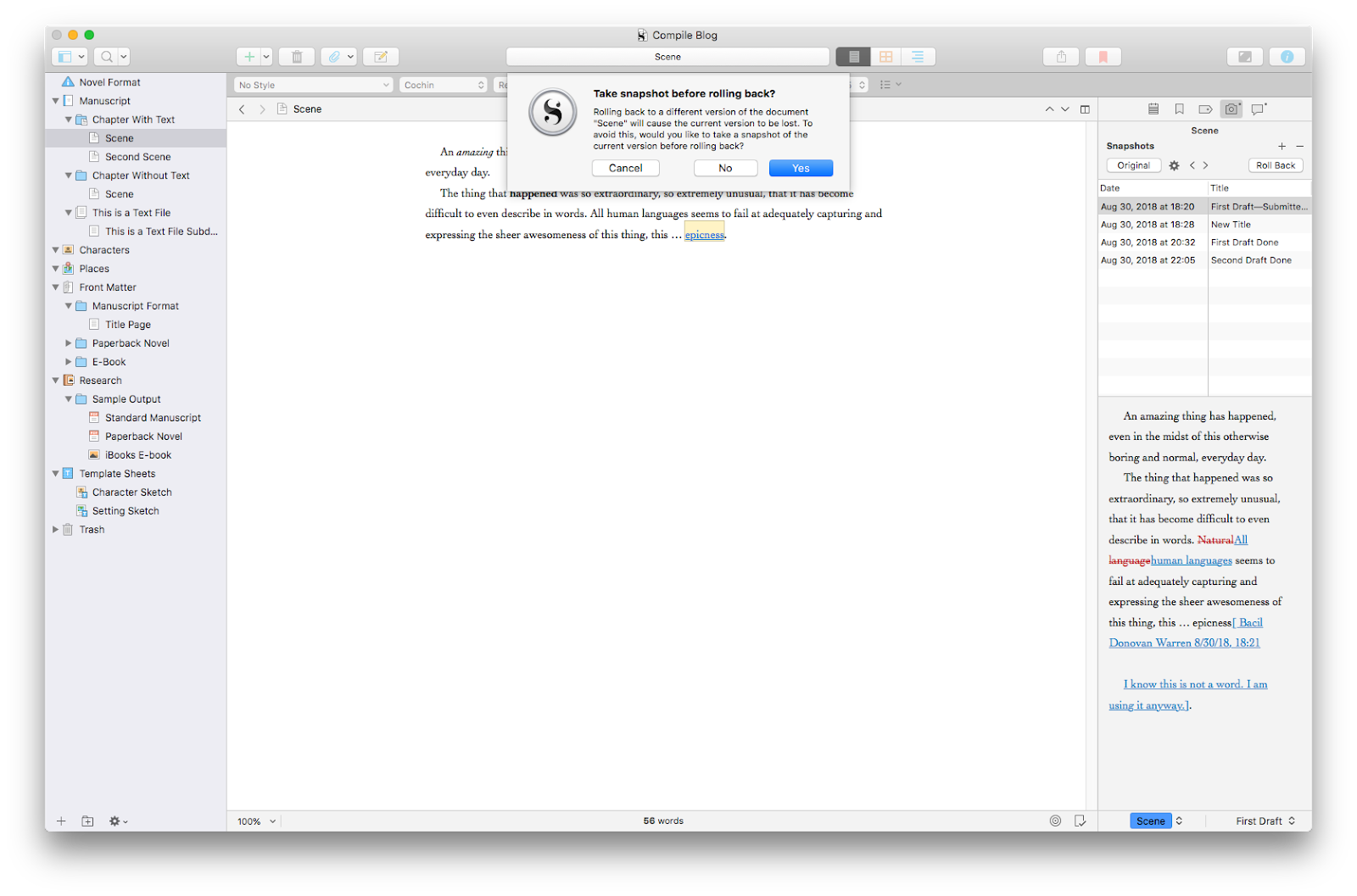 As for rolling back changes, once you’ve decided that you want to roll back to a Snapshot, select the Snapshot to which you want to roll back, and click the “Roll Back” button in the inspector. Because rolling back will destroy the current version, Scrivener will ask if you’d like to make a Snapshot of the current version of the document before rolling back the changes. If you are not 100% certain that you will not want the current version of the document, you can click “Yes” to create a new Snapshot of the current document, or “Cancel” to stop the roll back altogether.