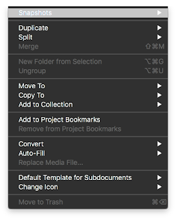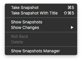 Once you’ve created a Snapshot of a document, it will appear in the list under the “Snapshots” tab in the inspector. In addition, all Snapshots in the entire project will appear in the Snapshots Manager (under the Documents menu, in Snapshots->Show Snapshots Manager).