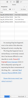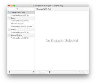 Today, I’d like to talk about one additional piece, the Snapshot feature of Scrivener, and how it works to help preserve your sanity (and documents!) while working on your project.