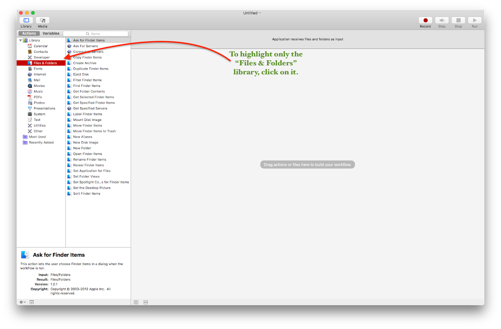 If all you see is a blank window with “Drag actions or files here to build your workflow, click “Library” in the top left corner. The first column should have “Actions” highlighted (if not, click on it), and the master container “Library” should be selected in the left most of those two columns.