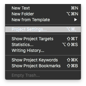Finally, it is also possible to override a couple of the backup settings on a per-project basis (by going into the Project menu and selecting “Project Settings…”, or typing Option-Command-comma on a Mac): The top checkbox, if checked “on,” will tell Scrivener to not automatically backup this particular project (all other projects will still be backed up automatically, unless they also have this setting checked “on”). The second checkbox allows you to specify a different location for this project’s backup files. The other settings remain unchanged, so if you have the settings to “Only keep” the 5 most recent backups, that will still apply. It will just use the folder you set here, instead of the one in the “Backup” pane of the Scrivener Preferences, and only for this project.