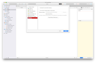 A word of caution about the backups. If you find you need to open a backup copy of a project, drag it out of the folder with the other backups. This can be by dragging it to the desktop, or making a copy in another folder, or (what I do) by holding down the option key and dragging the zip file to the desktop and then opening the zip file from there. Holding option while dragging a file or folder (or disk, or anything else really) in the Finder will create a copy of the dragged item. If you open a Scrivener project from within the folder it uses for automatic backups, you will get a warning dialog that the project is not in a recommended location. This will also happen if you tell Scrivener to use a folder for automatic backups where you are also saving your normal projects.