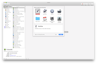 When Automator is first launched, it opens the standard Open dialog asking for you to choose a file. In the lower-left corner of that dialog is the “New Document” button. When you click that, it gives you an empty, untitled workflow, and asks you what kind of item it will be. For this, I created an Application. An Automator Application can be run on its own, and will sit in the Finder (wherever you put it) just like any other application. Another option would be to create a Workflow, which can’t be run on its own, but instead runs from within Automator. Either of these two would work, but I chose to make an Application. That way, when it was working the way I needed it to work, I could save it to my desktop and run it by itself.